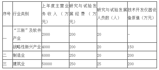 8.上年度主营业务收入、研究与试验发展经费、研究与试验发展人员数、技术开发仪器设备原值4项指标,不低于限定性指标的最低标准(见下表)。