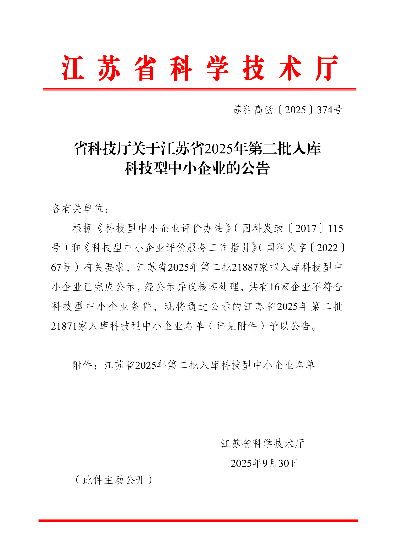 省科技厅关于江苏省2025年第二批入库科技型中小企业的公告