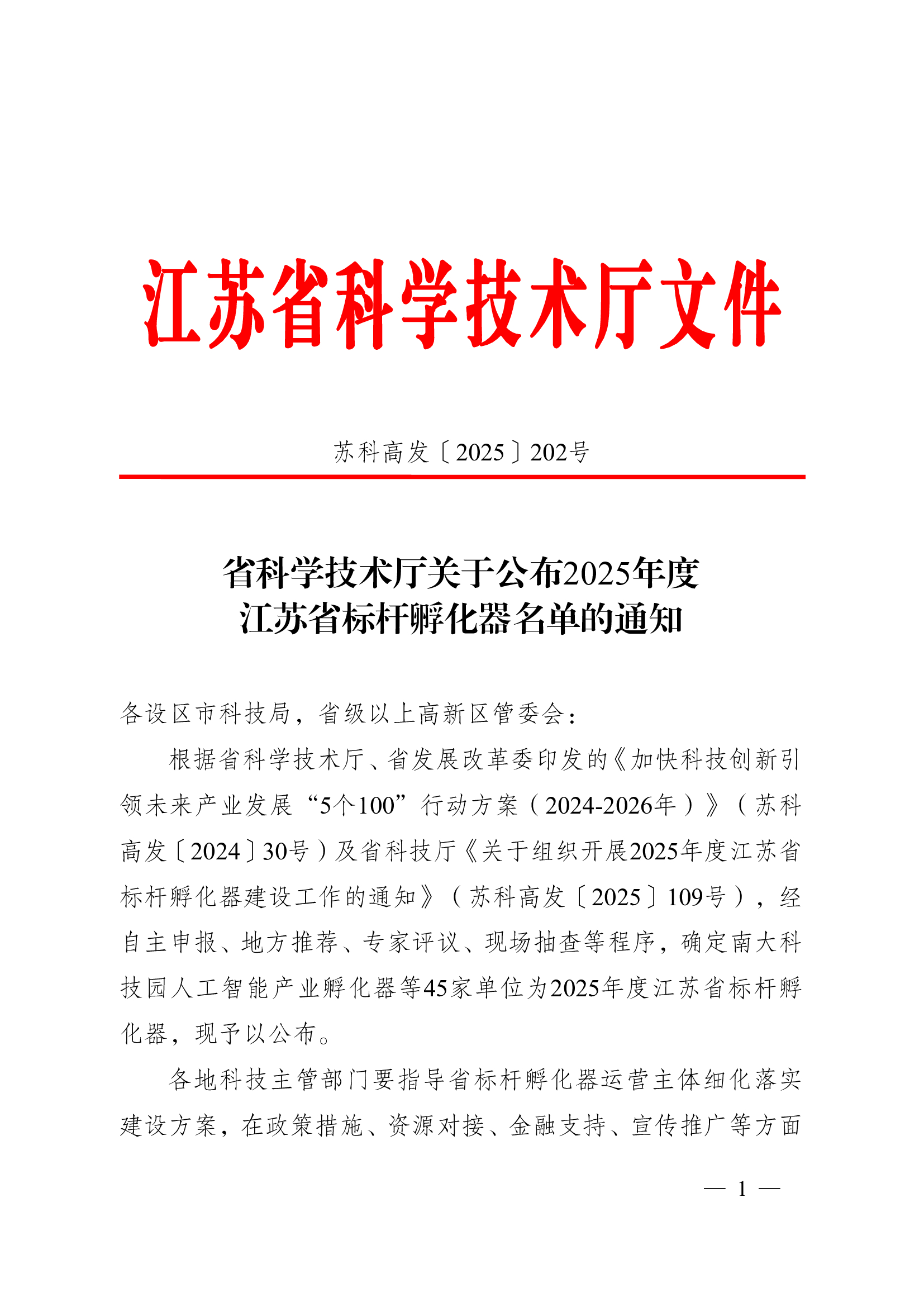 省科学技术厅关于公布2025年度江苏省标杆孵化器名单的通知