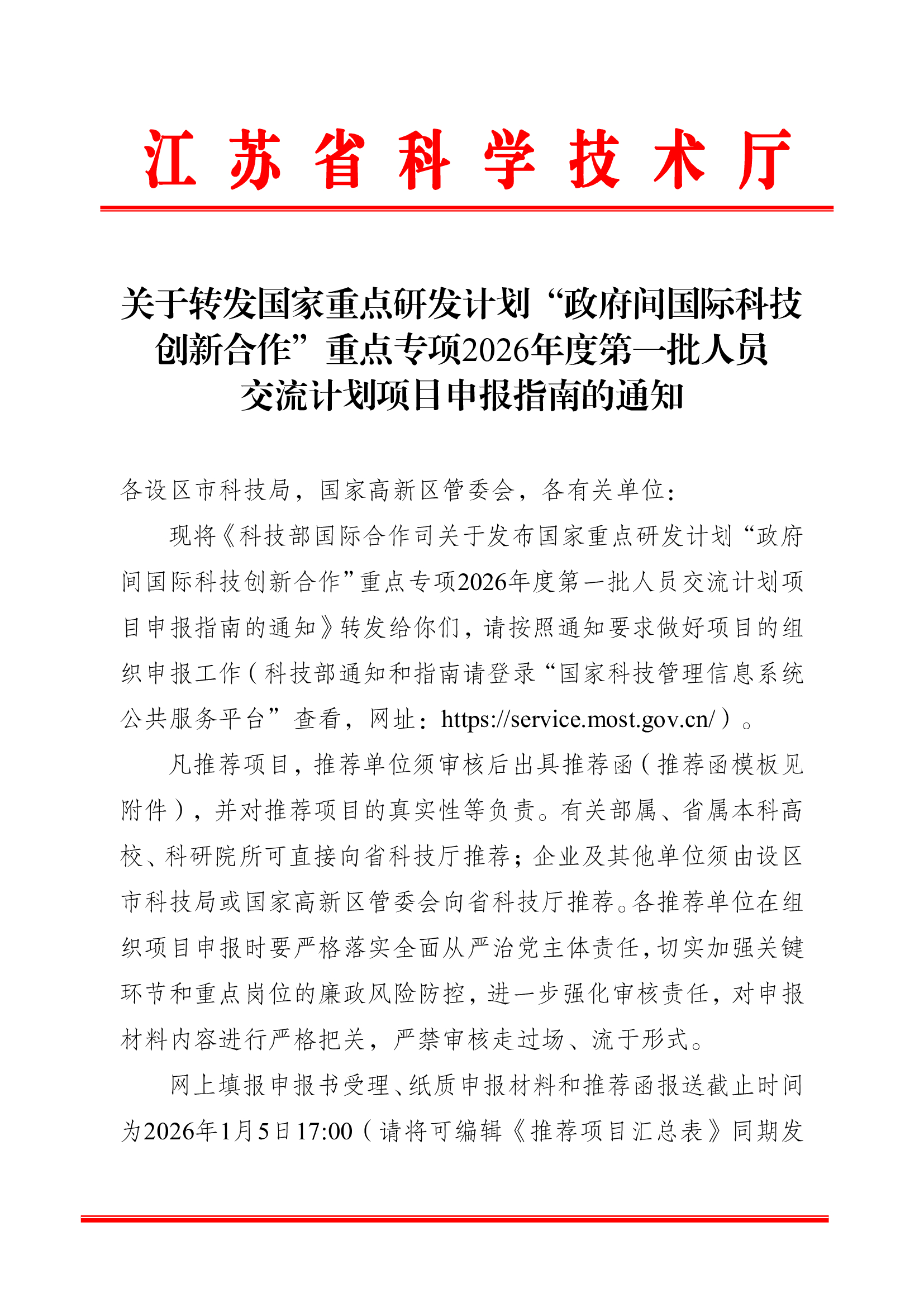 江苏省科学技术厅 关于转发国家重点研发计划“政府间国际科技创新合作”重点专项2026年度第一批人员交流计划项目申报指南的通知