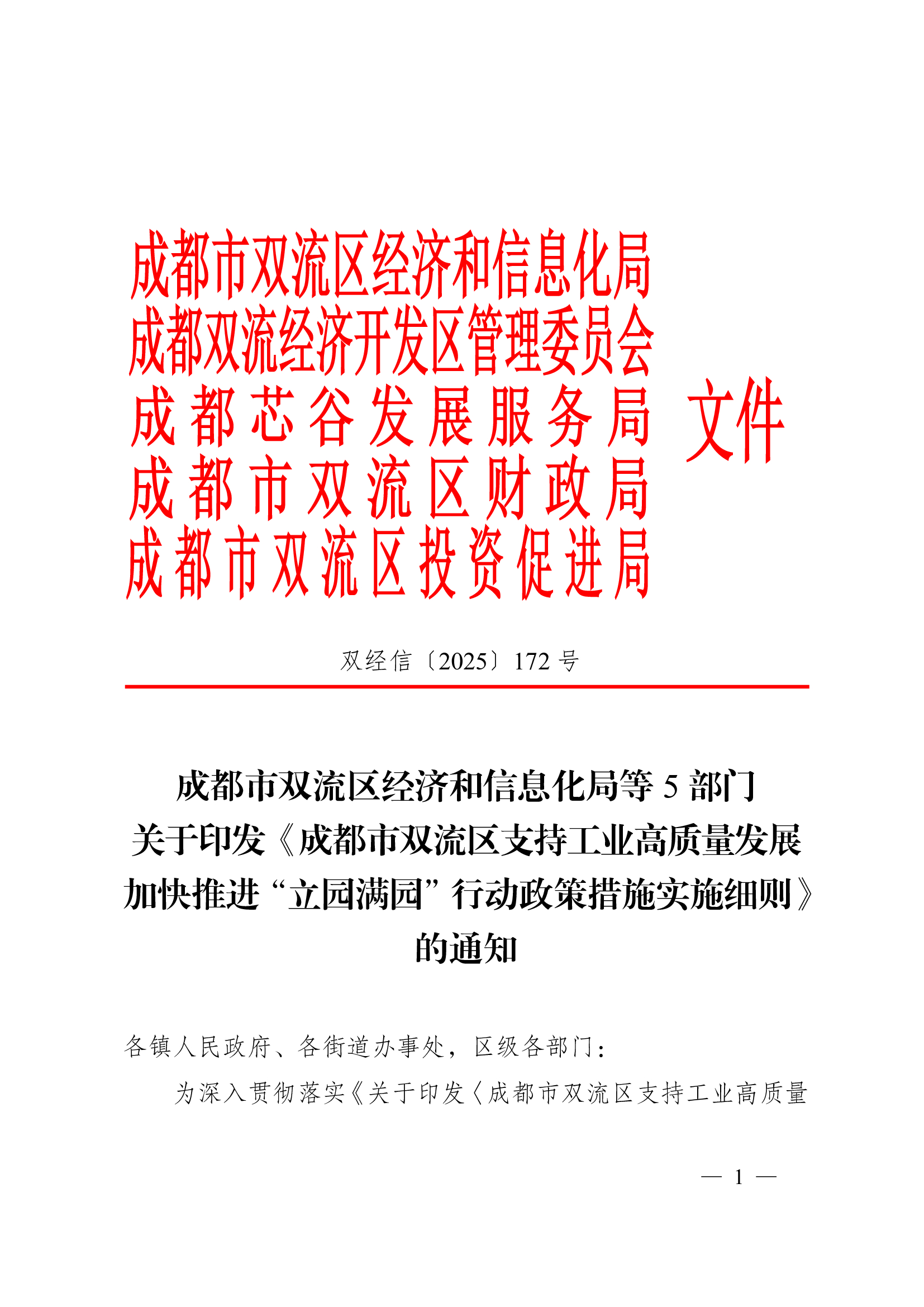 关于印发《成都市双流区支持工业高质量发展加快推进“立园满园”行动政策措施实施细则》的通知