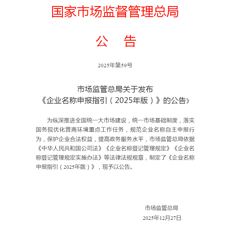 市场监管总局关于发布《企业名称申报指引(2025年版)》的公告