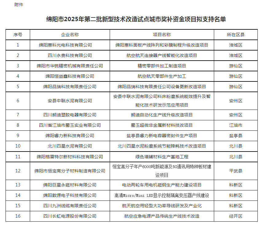 根据财政厅、经济和信息化厅工作安排,按照绵阳市经济和信息化局《关于做好绵阳市2025年第二批新型技术改造试点城市奖补资金项目申报的通知》(绵经信技改〔2025〕179号)、《关于补充征集绵阳市2025年第二批新型技术改造试点城市奖补资金项目申报的通知》(绵经信技改〔2025〕195号)要求,通过企业自主申报,县(市、区)、园区工业经济主管部门初审推荐,经相关科室审核、专家评审、现场核实、征求相关行业主管部门意见和市经信局党组会审议等程序,现对拟支持的16个项目名单予以公示。