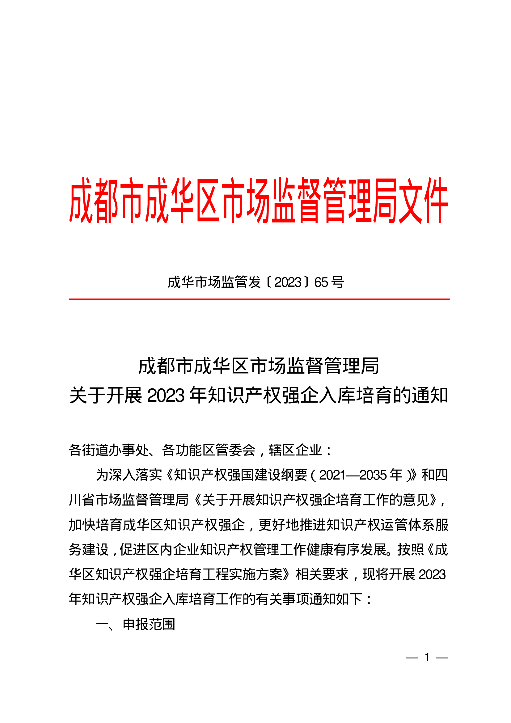 成华市场监管发2023-65号 关于开展2023年知识产权强企入库培育的通知