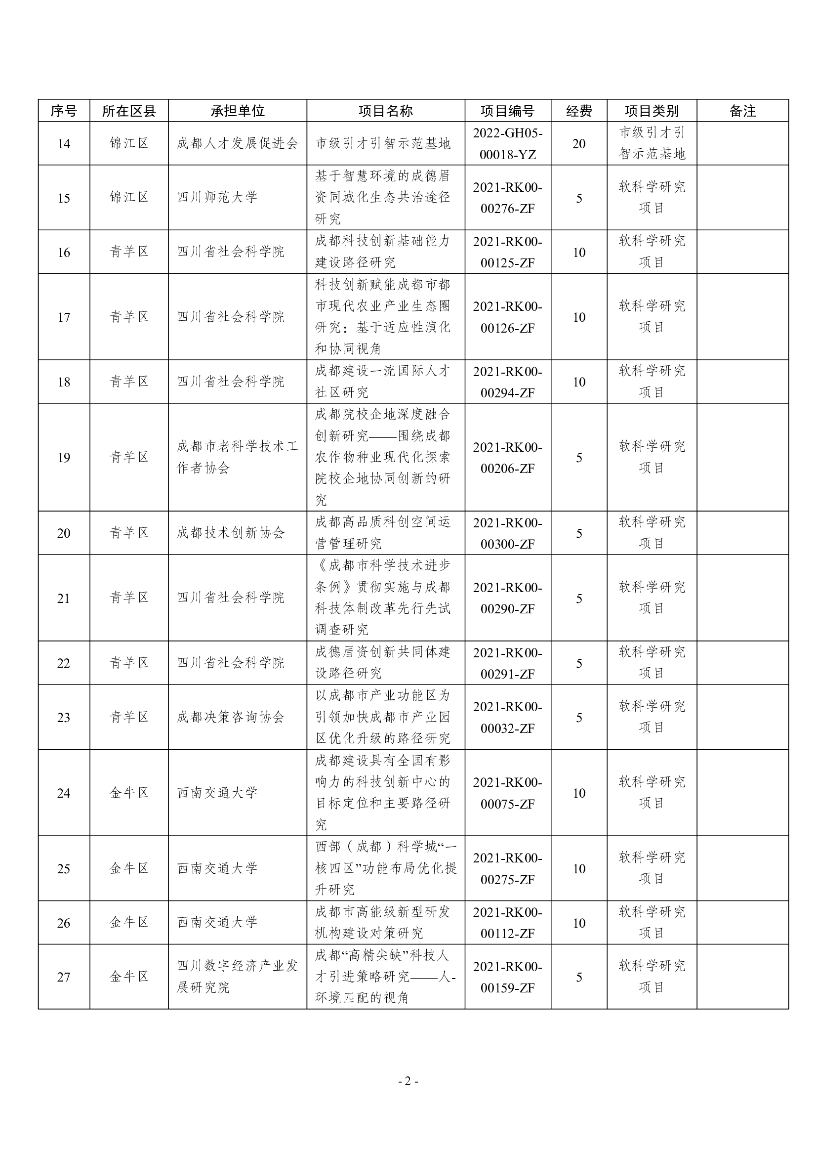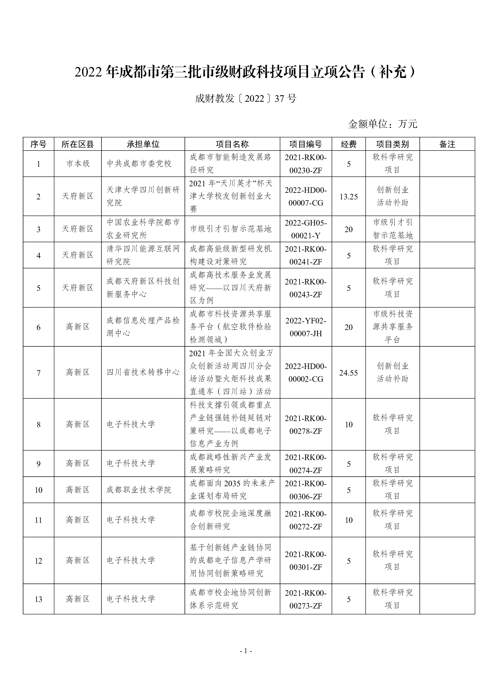 2022年成都市第三批市级财政科技项目立项公告(补充)(成财教发〔2022〕37号)
