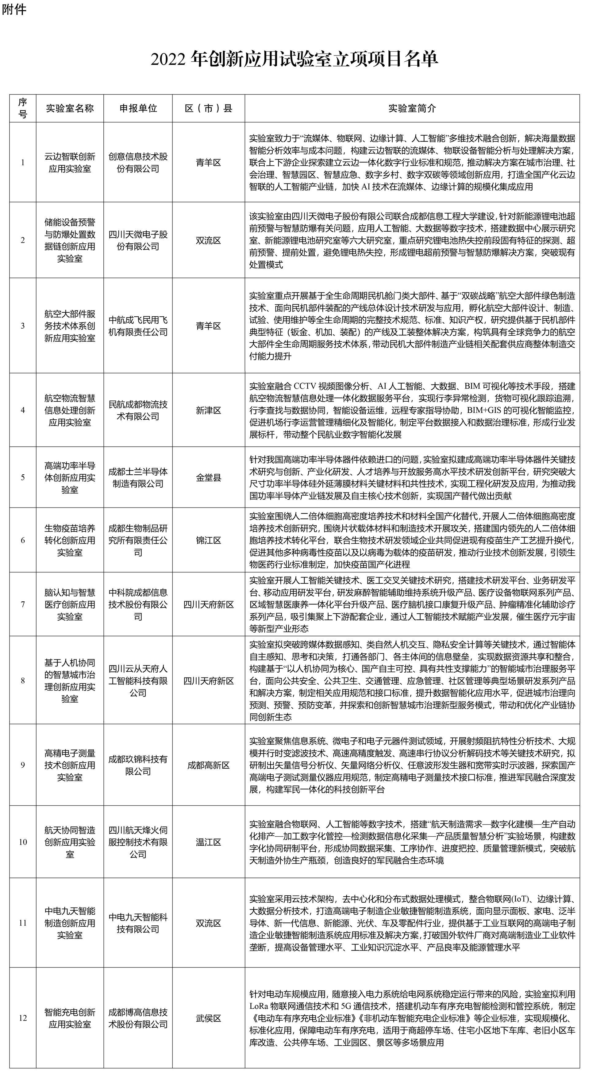 按照《关于印发供场景给机会加快新经济发展若干政策措施的通知》(成办发〔2020〕34号)和《关于组织开展2022年创新应用实验室申报工作的通知》(〔2022〕—130号)等文件精神,经企业申报、区(市)县初审、专家评审、公示等程序,确定“云边智联创新应用实验室”等12个项目为2022年创新应用实验室,现予以公布。