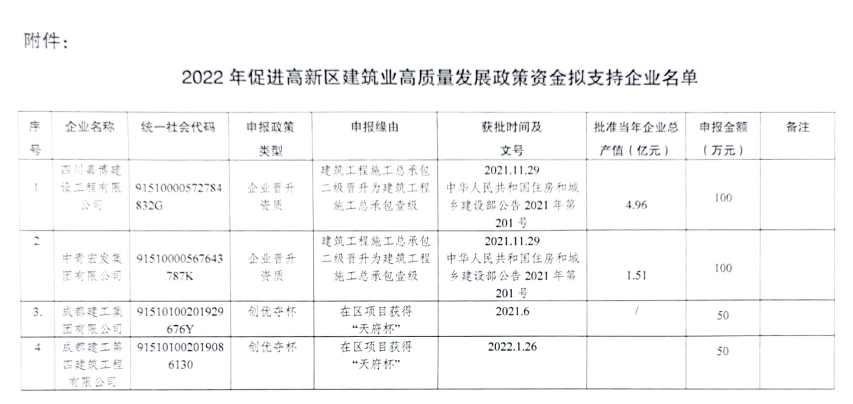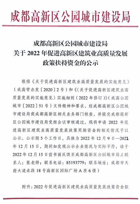 成都高新区公园城市建设局关于2022年促进高新区建筑业高质量发展政策扶持资金的公示
