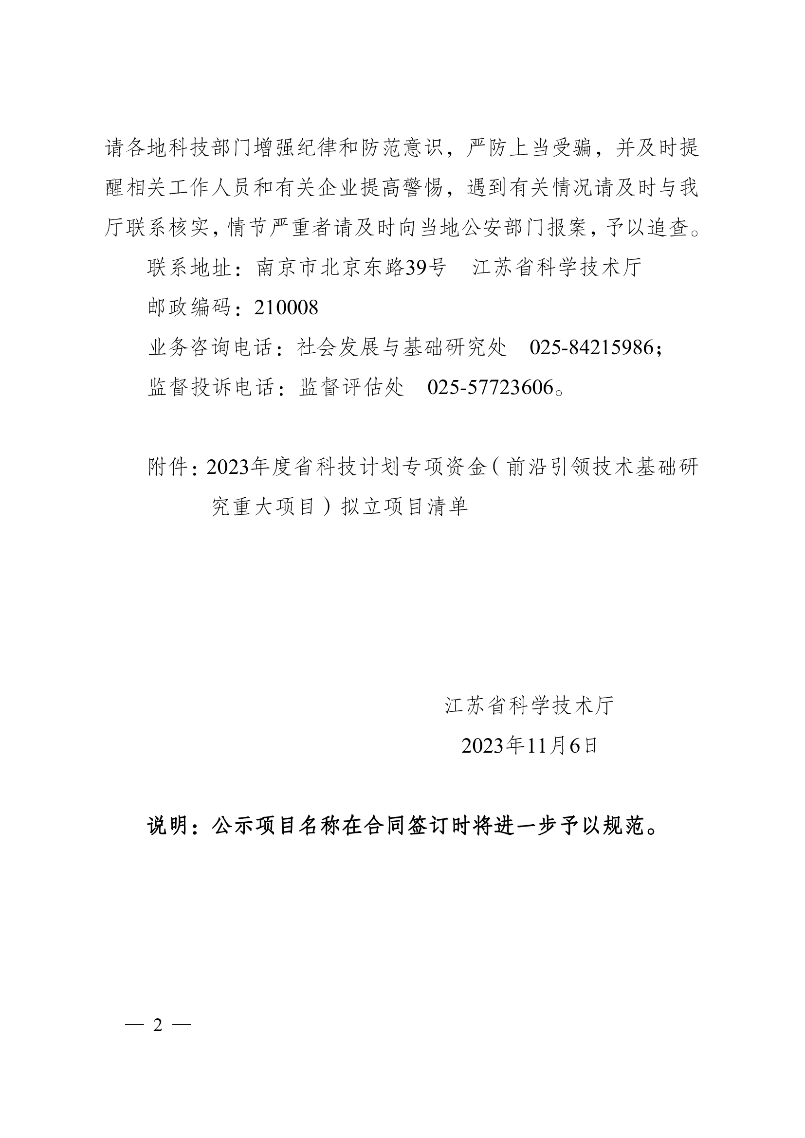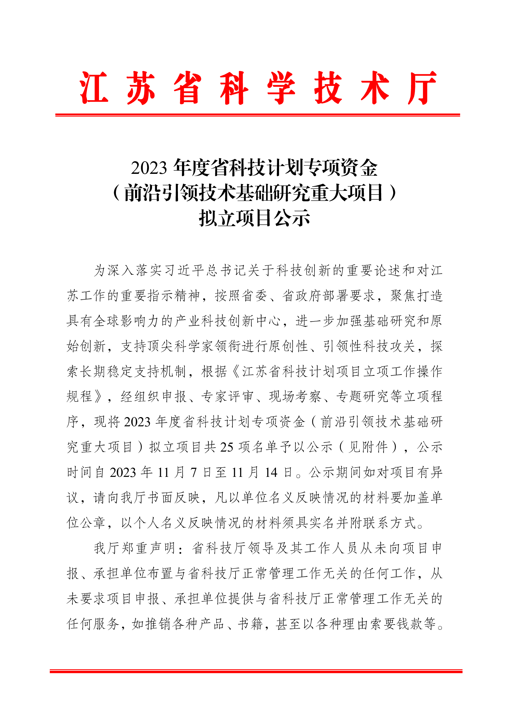 2023年度江苏省科技计划专项资金(前沿引领技术基础研究重大项目)拟立项目公示