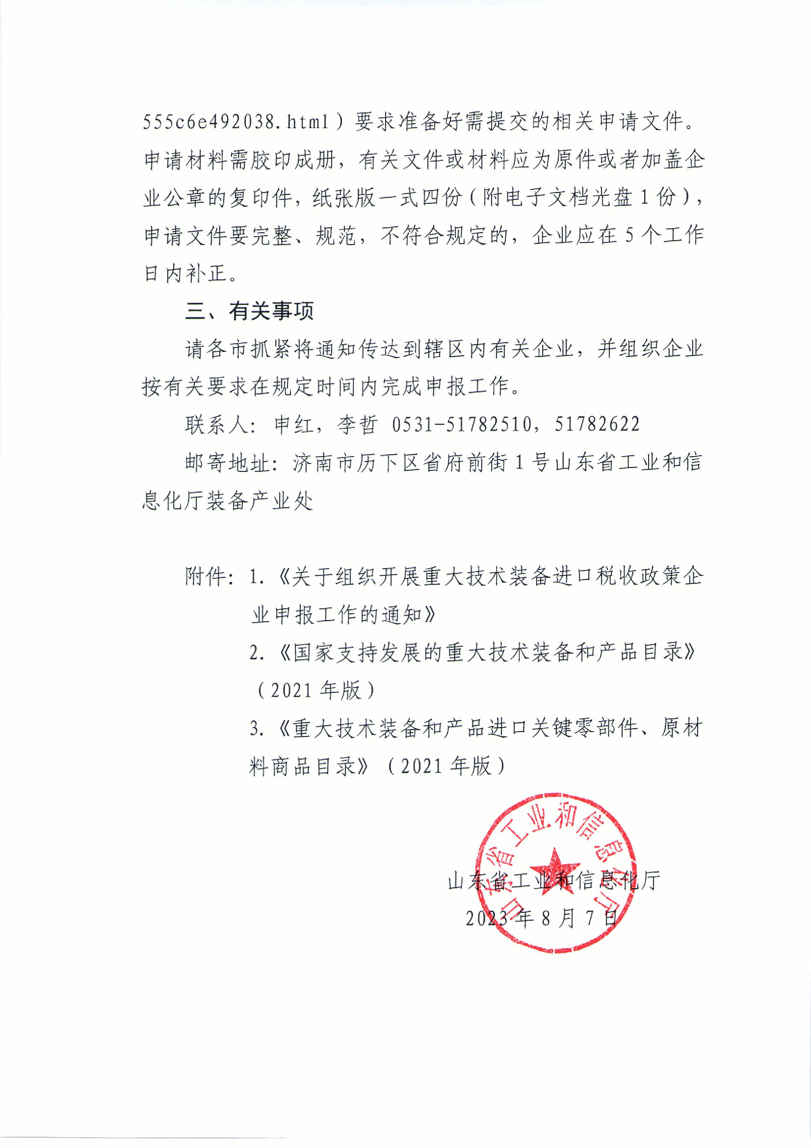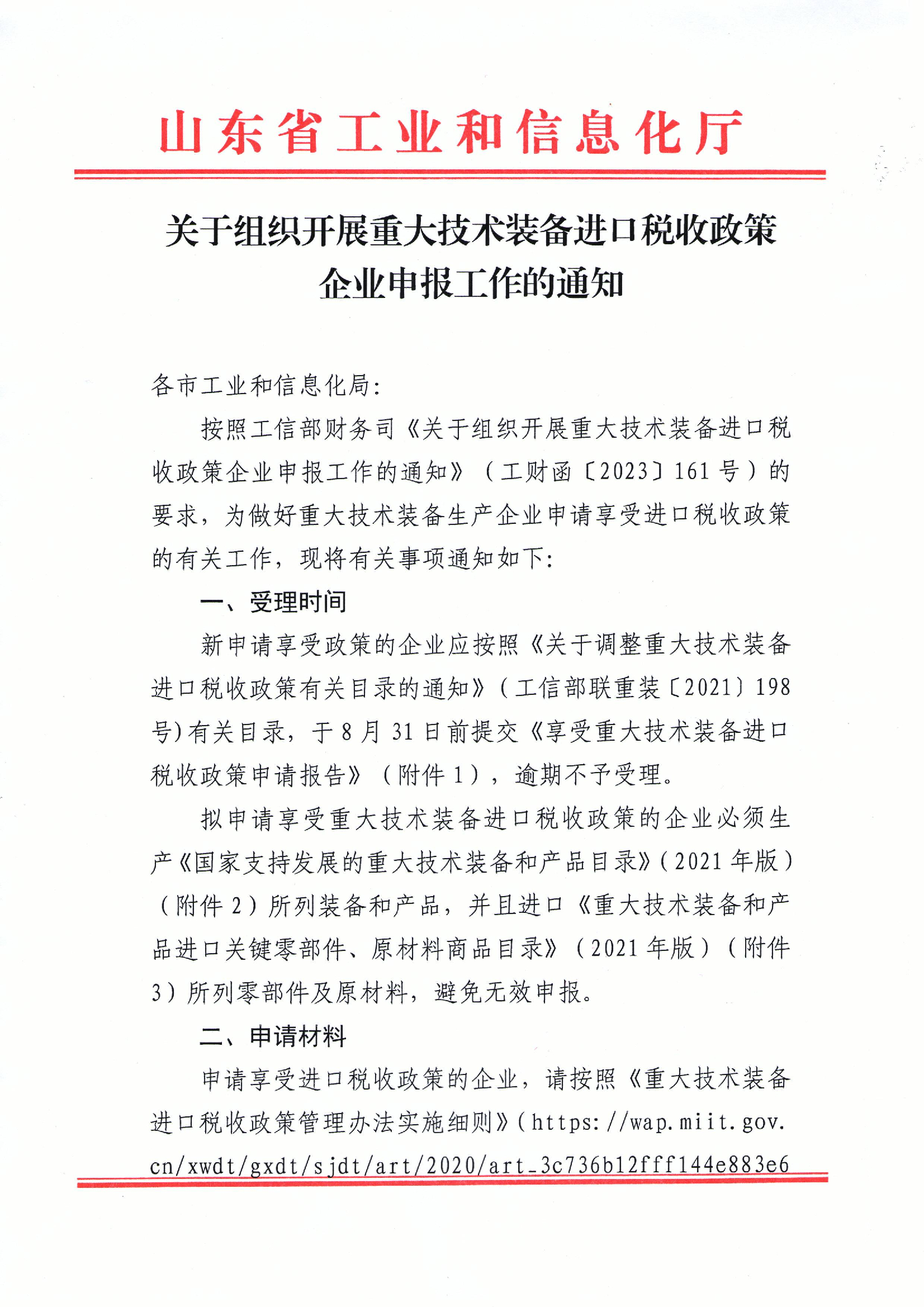 山东省工业和信息化厅 关于组织开展重大技术装备进口税收政策企业申报工作的通知