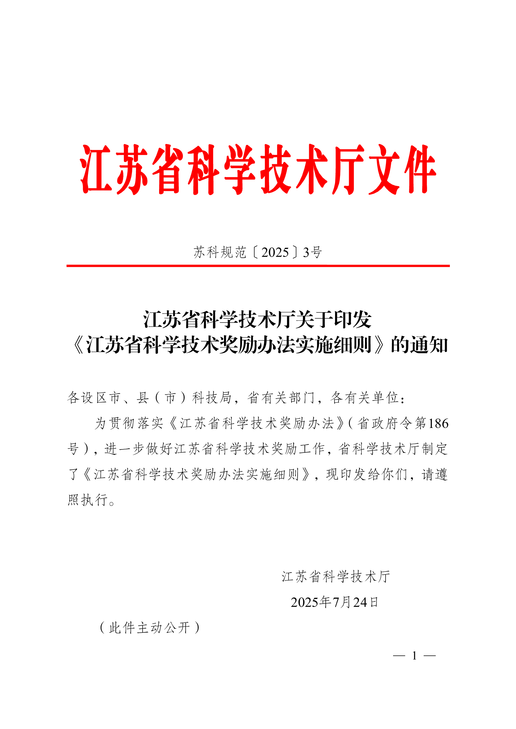 江苏省科学技术厅关于印发《江苏省科学技术奖励办法实施细则》的通知