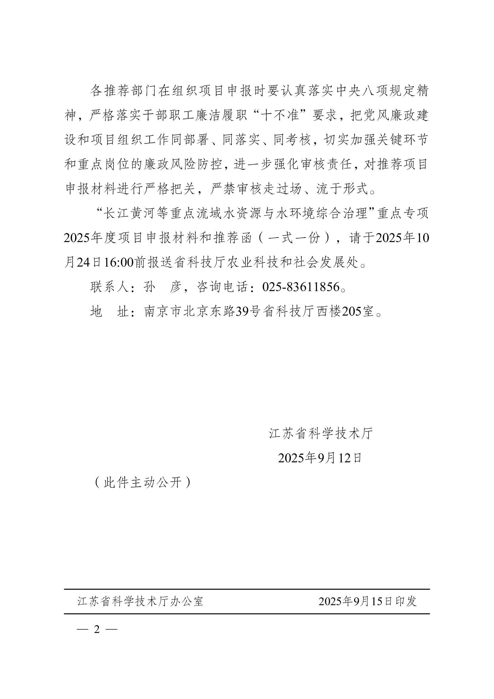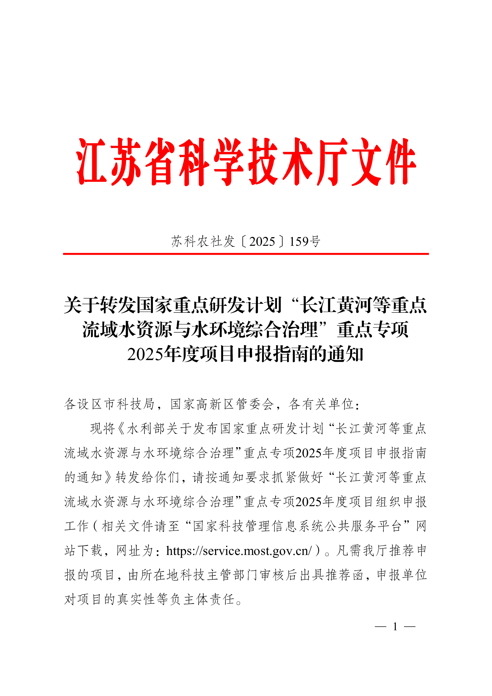 江苏省科学技术厅 关于转发国家重点研发计划“长江黄河等重点流域水资源与水环境综合治理”重点专项2025年度项目申报指南的通知