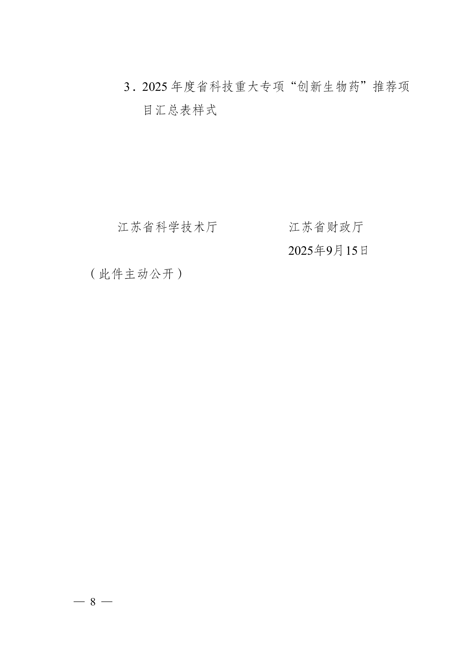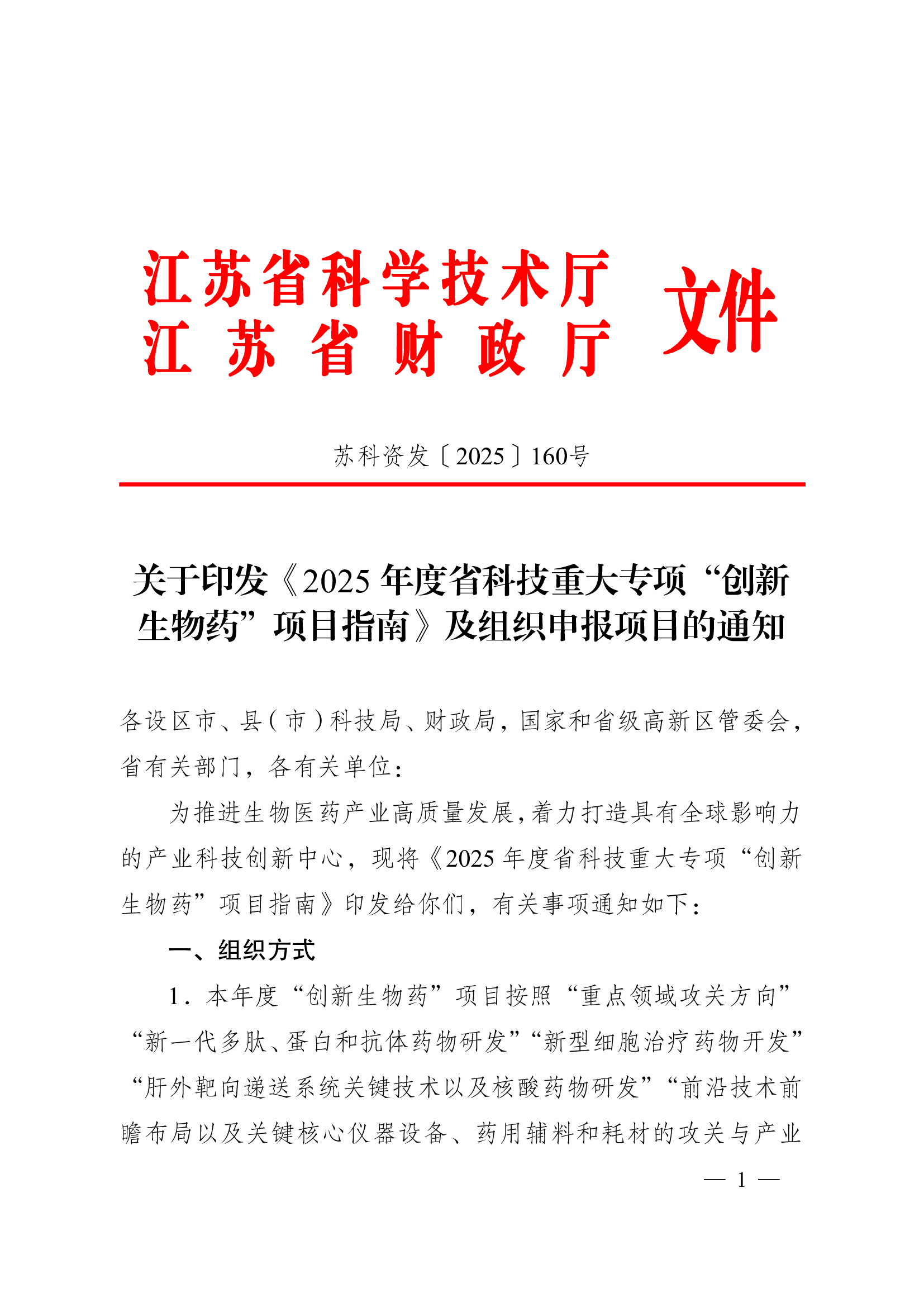 江苏省科学技术厅 关于印发《2025年度省科技重大专项“创新生物药”项目指南》及组织申报项目的通知
