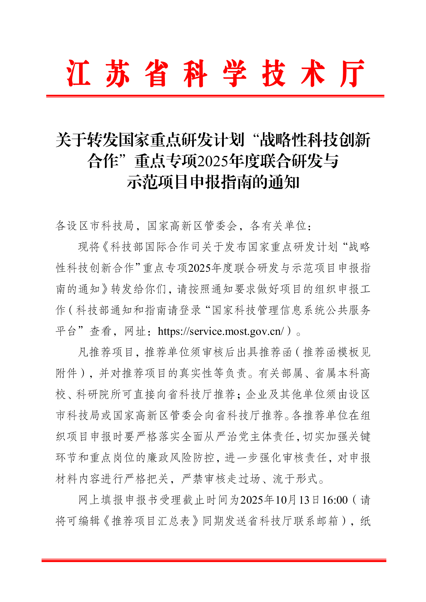 江苏省科学技术厅 关于转发国家重点研发计划“战略性科技创新合作”重点专项2025年度联合研发与示范项目申报指南的通知