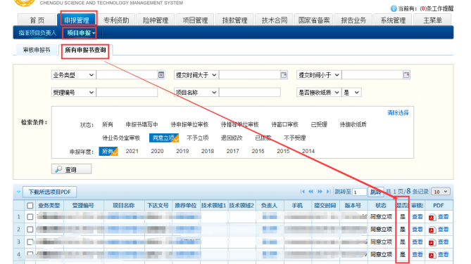 项目负责人可通过管理系统在线查询确认纸件材料办理结果:市政务服务中心科技局窗口未确认收到纸件材料前,对应项目申报书在管理系统中“是否接收纸质”状态为“否”(如图9所示);市政务服务中心科技局窗口收到纸件材料后,在管理系统确认收件,管理系统自动将对应项目“是否接收纸质”状态修改为“是”(如图10所示)。