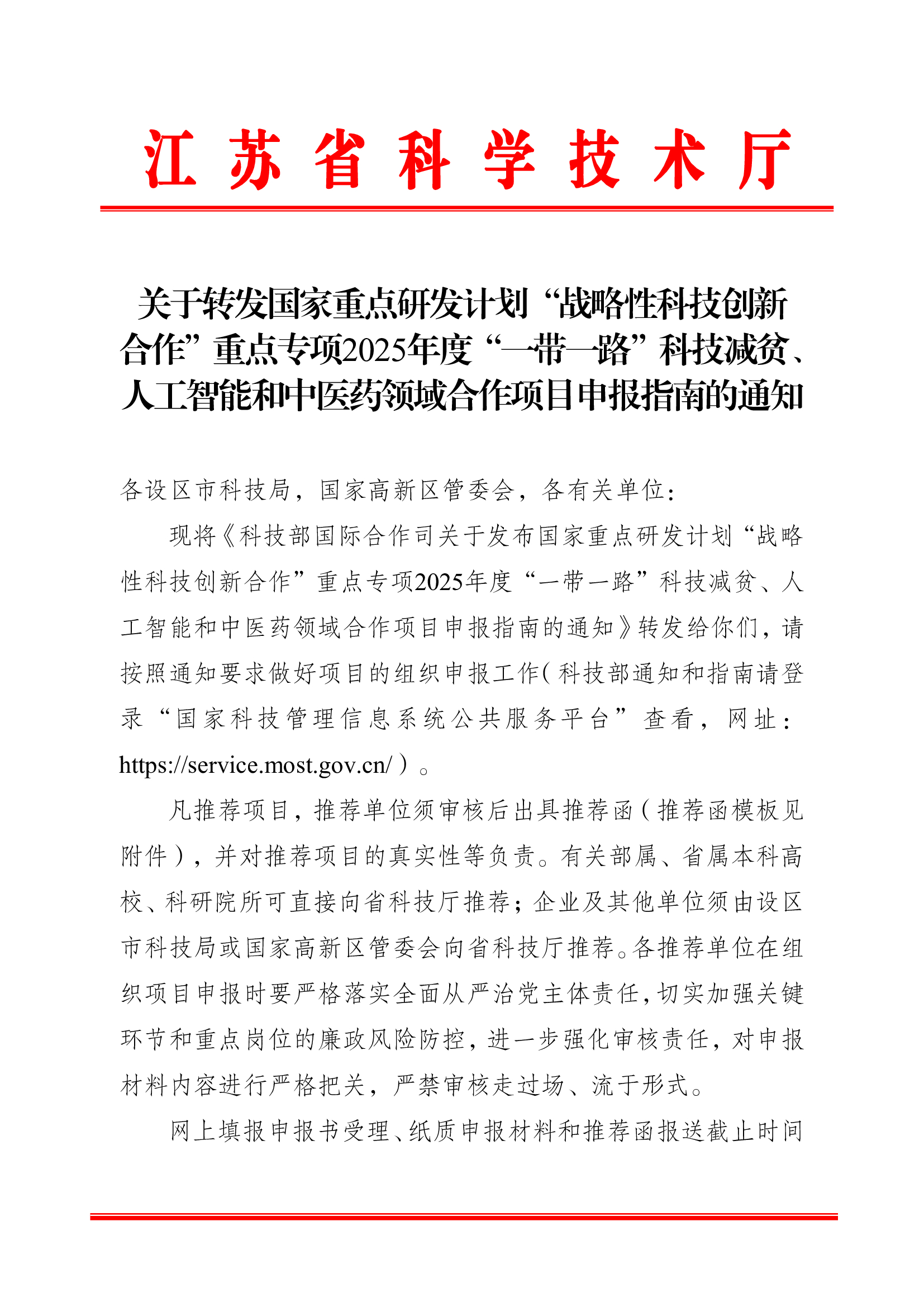 江苏省科学技术厅 关于转发国家重点研发计划“战略性科技创新合作”重点专项2025年度“一带一路”科技减贫、人工智能和中医药领域合作项目申报指南的通知
