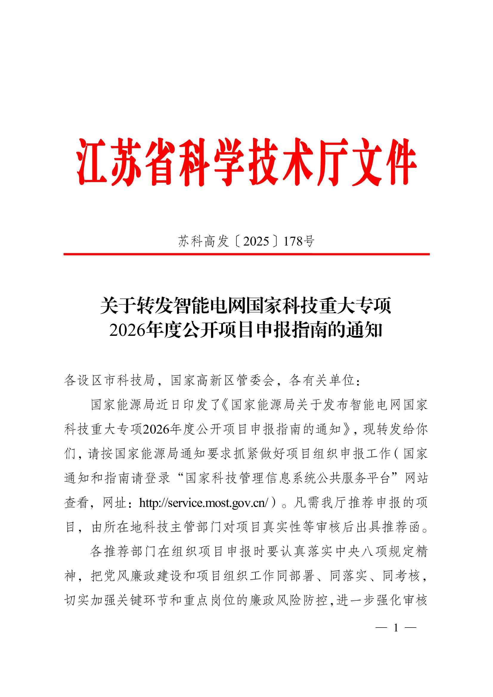 江苏省科学技术厅 关于转发智能电网国家科技重大专项2026年度公开项目申报指南的通知