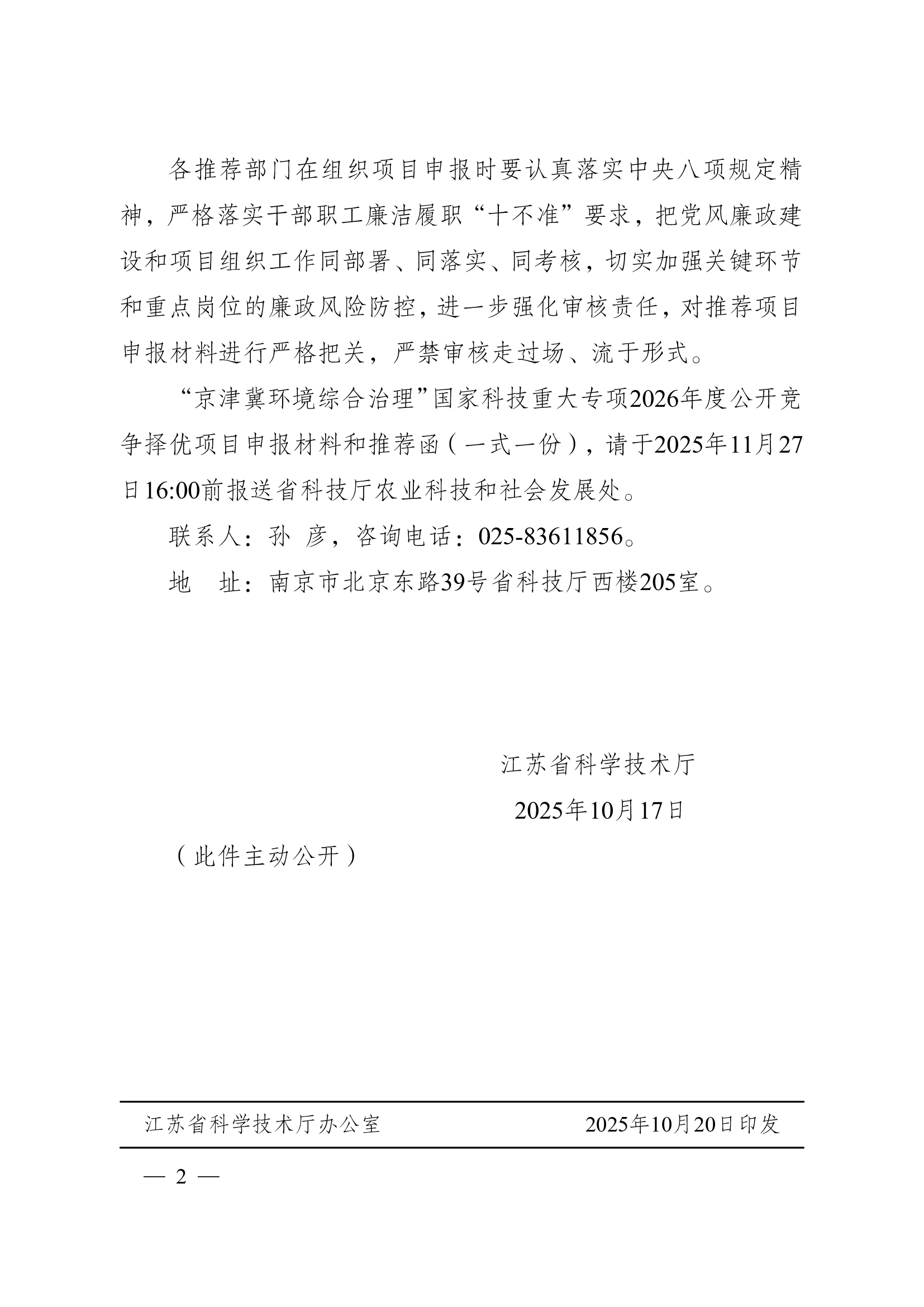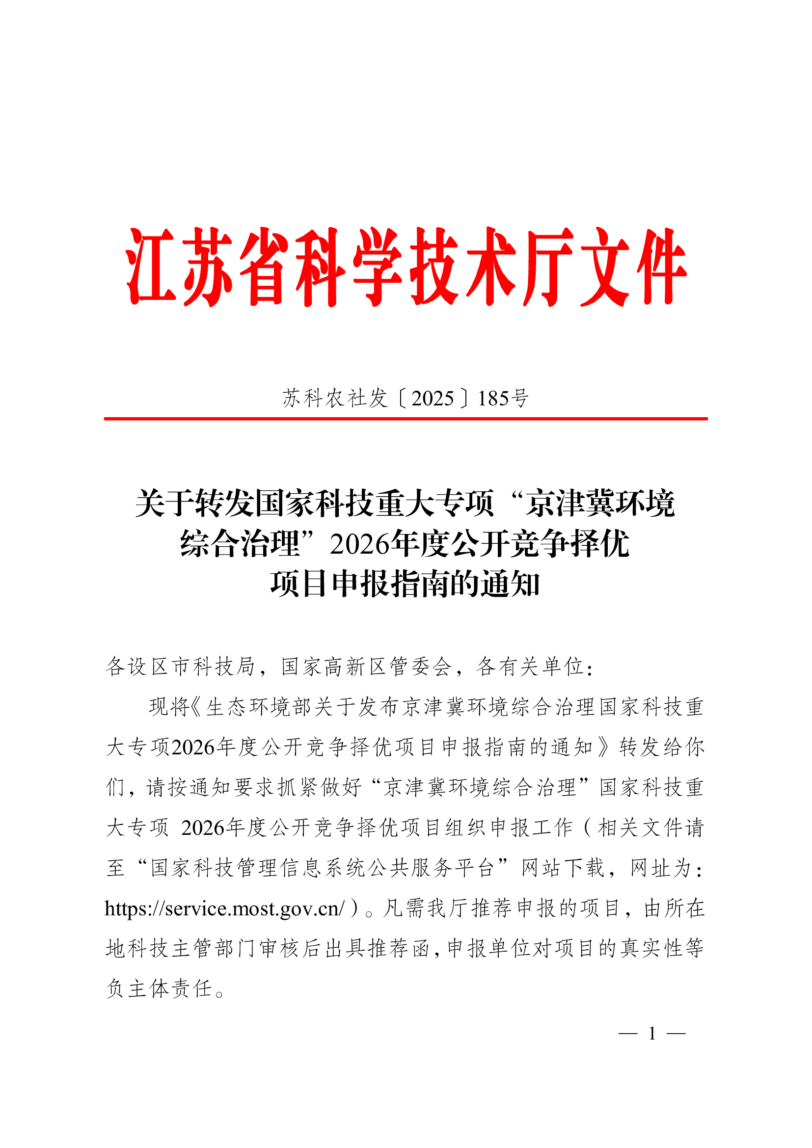 江苏省科学技术厅 关于转发国家科技重大专项“京津冀环境综合治理”2026年度公开竞争择优项目申报指南的通知