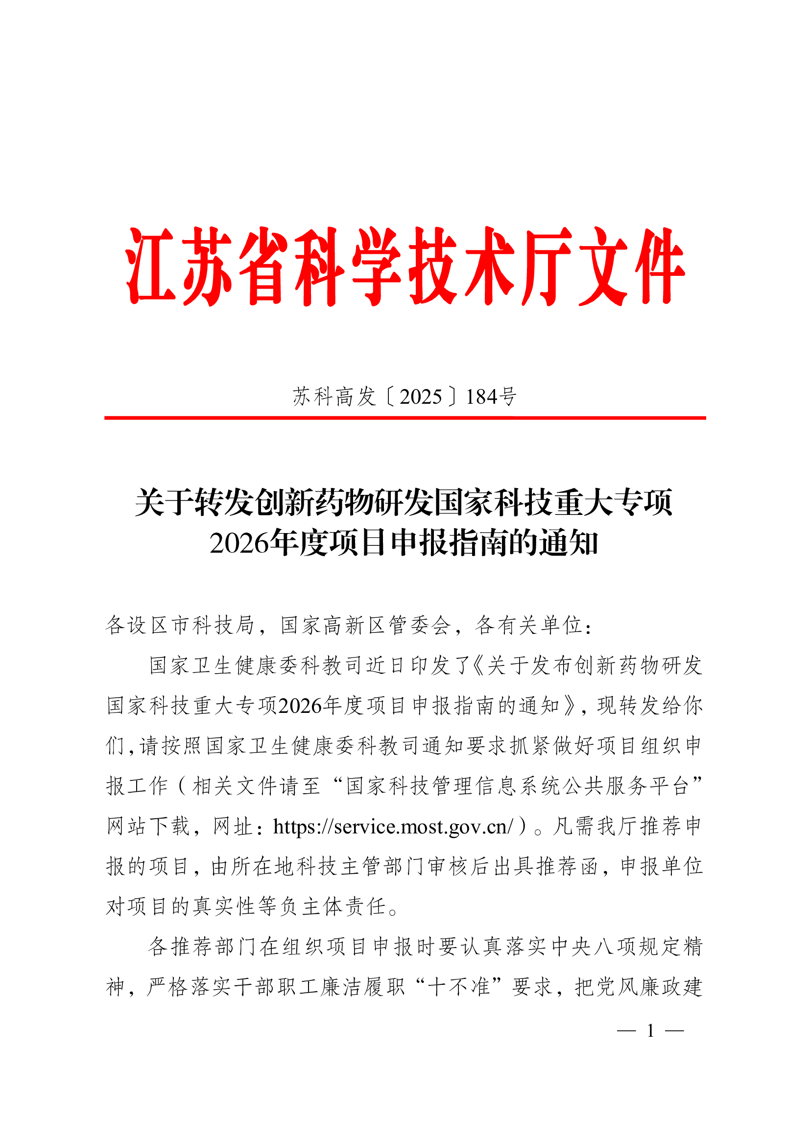 江苏省科学技术厅 关于转发创新药物研发国家科技重大专项2026年度项目申报指南的通知