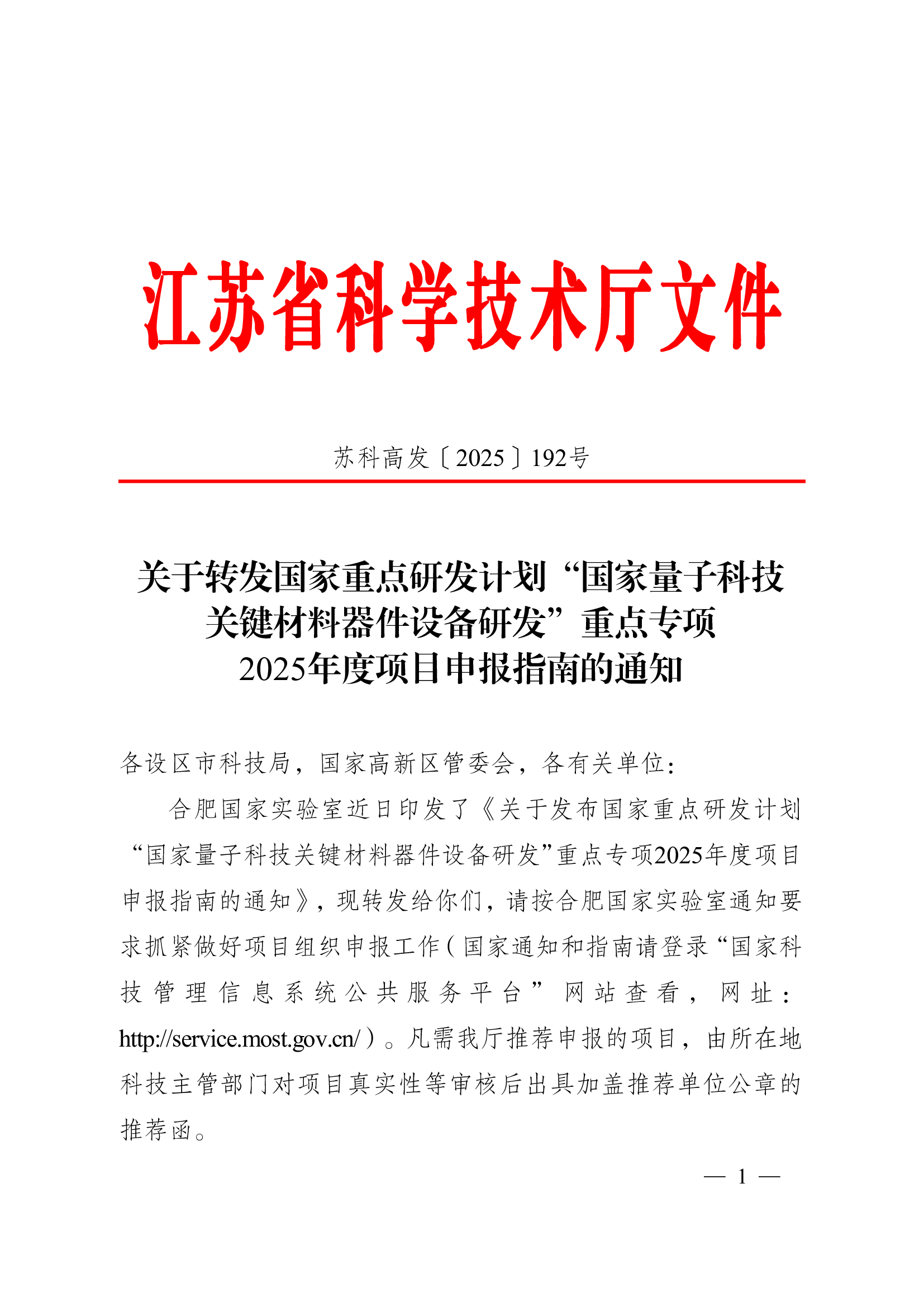 江苏省科学技术厅 关于转发国家重点研发计划“国家量子科技关键材料器件设备研发”重点专项2025年度项目申报指南的通知