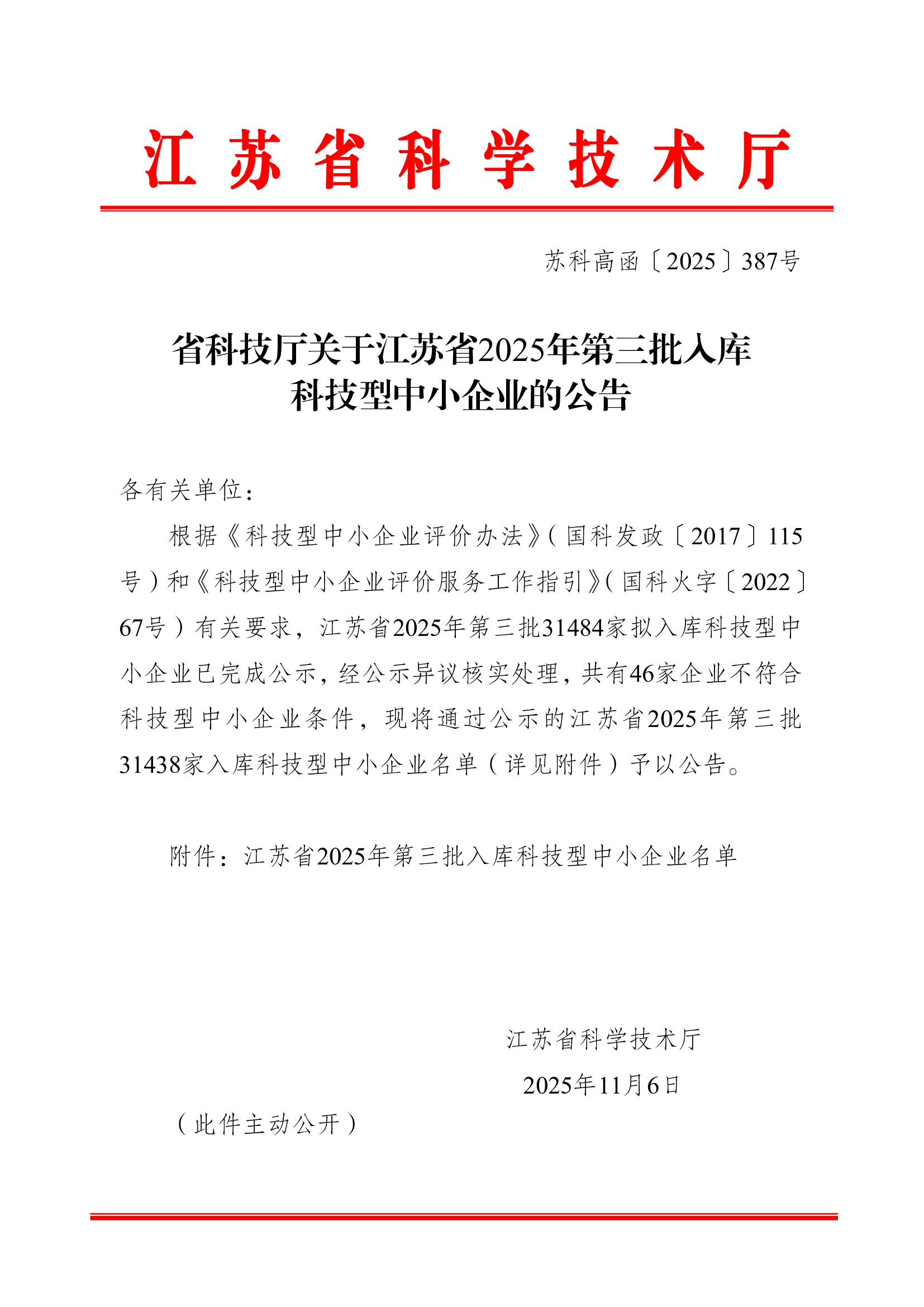 省科技厅关于江苏省2025年第三批入库科技型中小企业的公告