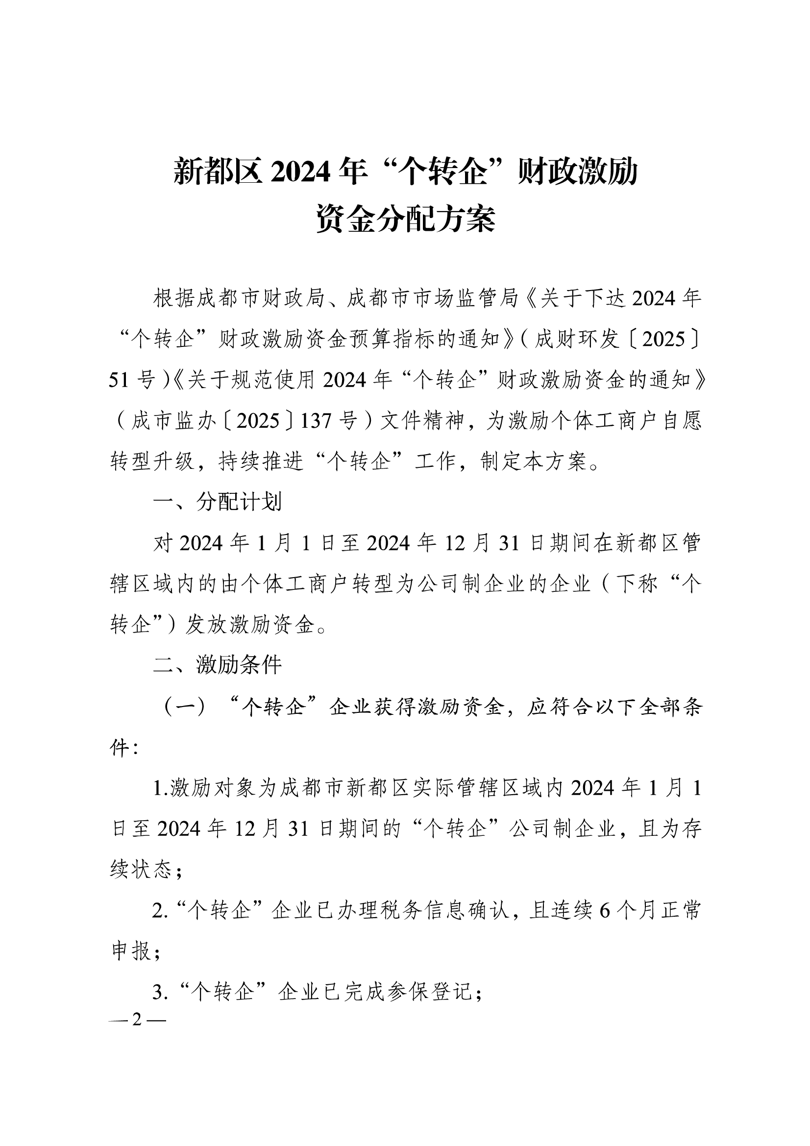 成都市新都区市场监督管理局关于印发《新都区 2024年“个转企”财政激励资金分配方案》的通知