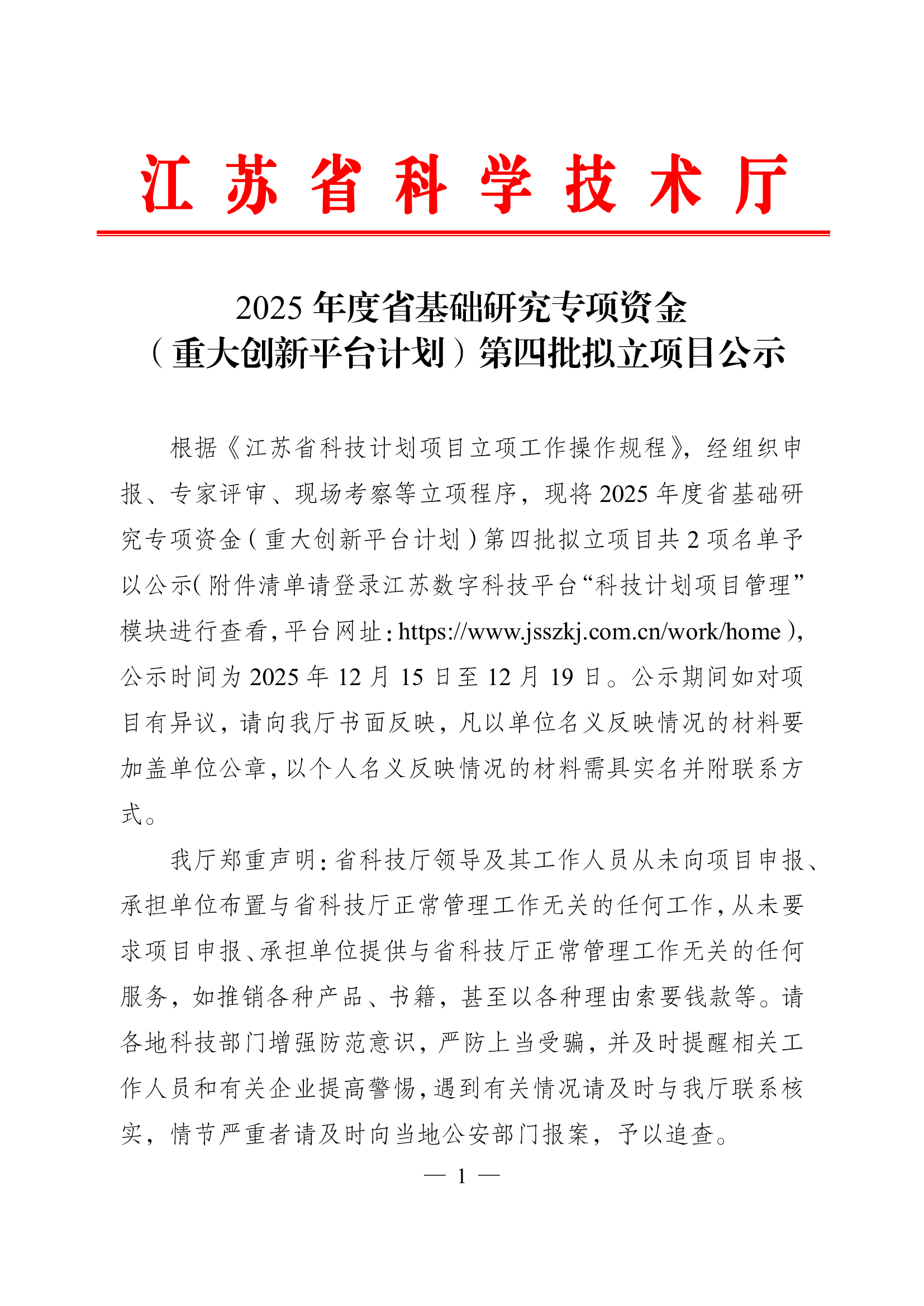 江苏省科学技术厅 2025年度省基础研究专项资金(重大创新平台计划)第四批拟立项目公示