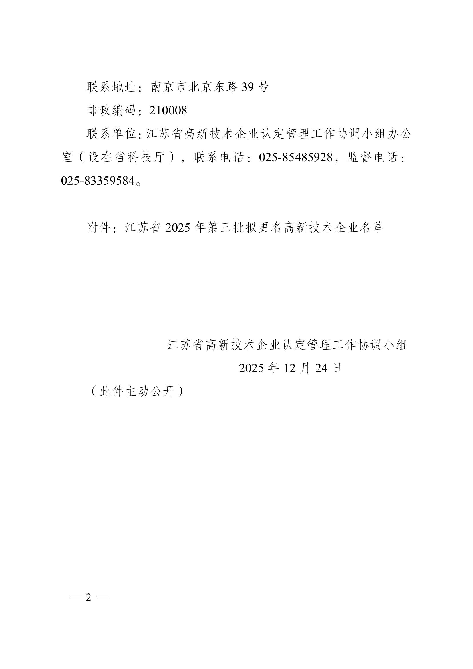 关于江苏省2025年第三批拟更名高新技术企业名单的公示