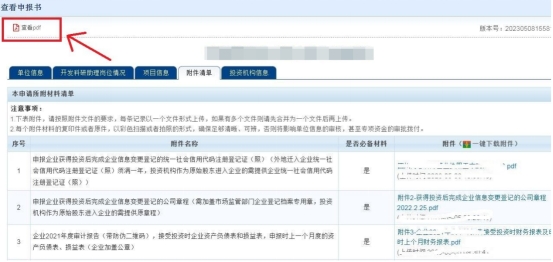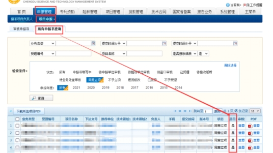 项目负责人使用本人账号登录“成都市科技项目管理系统”(网址:***;管理系统”),点击本项目对应的“项目名称”(如图5所示),再点击“查看pdf”(如图6所示),完成申报书下载;再点击“附件清单”-“一键下载附件”(如图7所示),完成附件下载(提示:附件可直接下载打印,无需重新另外准备;若下载的附件存在打印后不清晰情况,应替换为清晰件)。