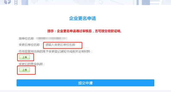 如单位已更名,请先点击“更名申请”链接,完成更名(如图4所示)后再完成确认收款证明操作。