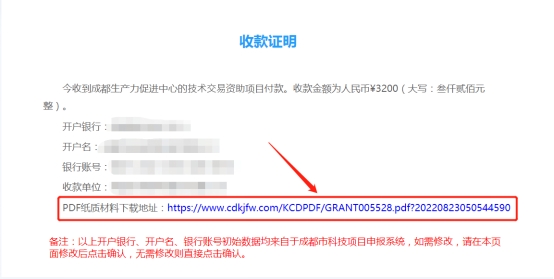 项目负责人点击确认“确认收款证明”链接,核实《收款证明》中本单位的“开户银行”“开户名”“银行账号”“收款单位”等信息无误后点击“确认”(如图1所示),再点击“PDF纸质材料下载地址”(如图2所示),形成带水印的电子版《收款证明》(如图3所示),下载打印《收款证明》后加盖单位公章及财务章。