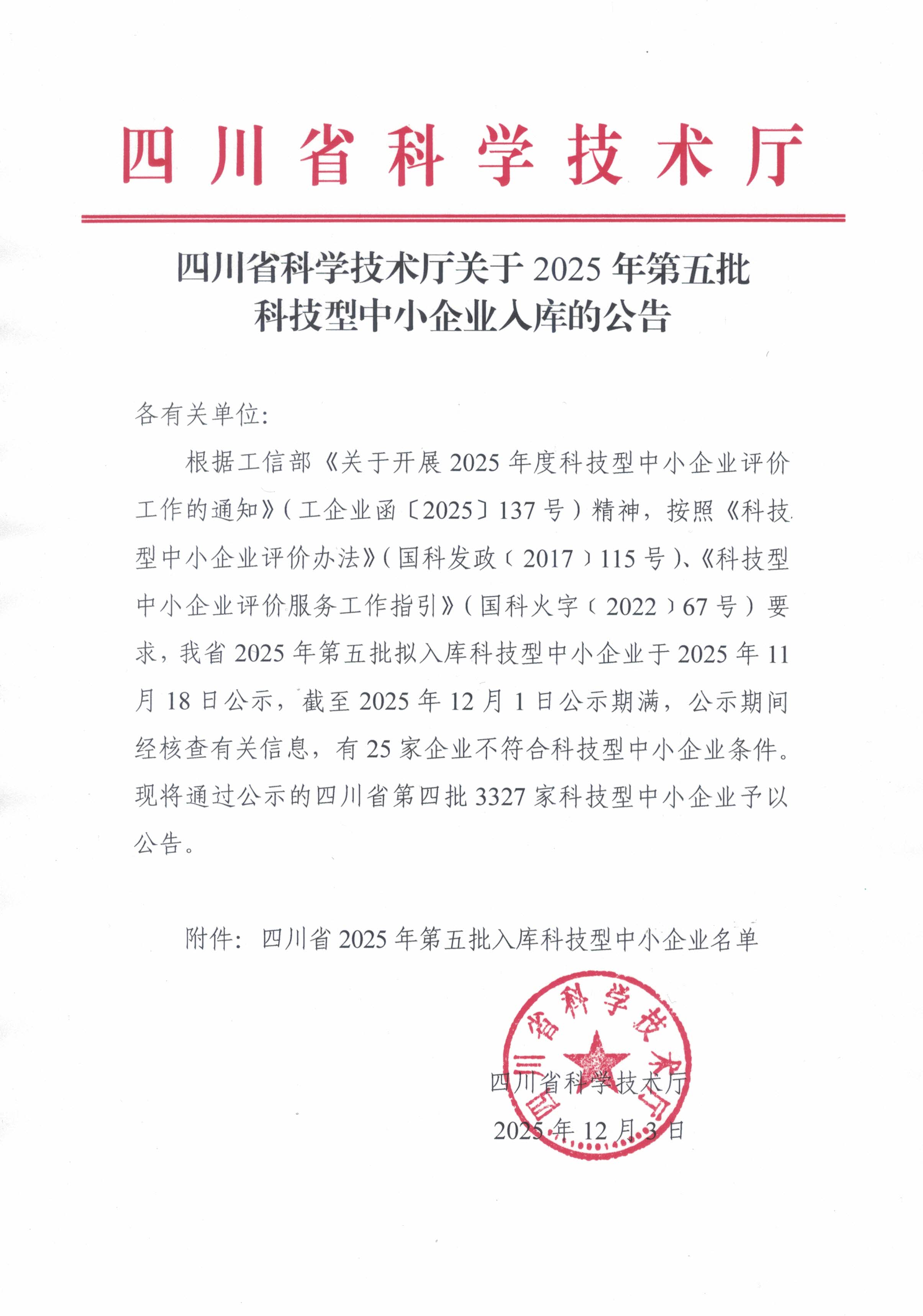 四川省2025年第5批入库科技型中小企业名单公告