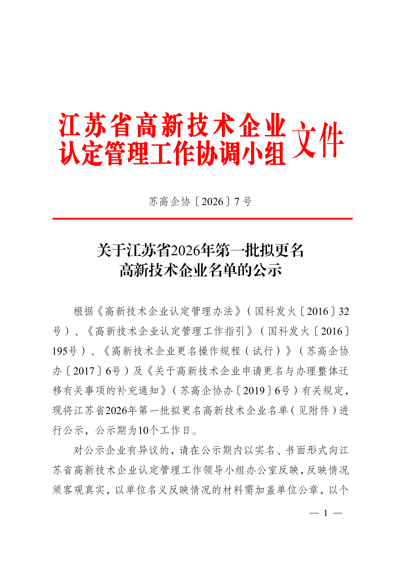 关于江苏省2026年第一批拟更名高新技术企业名单的公示