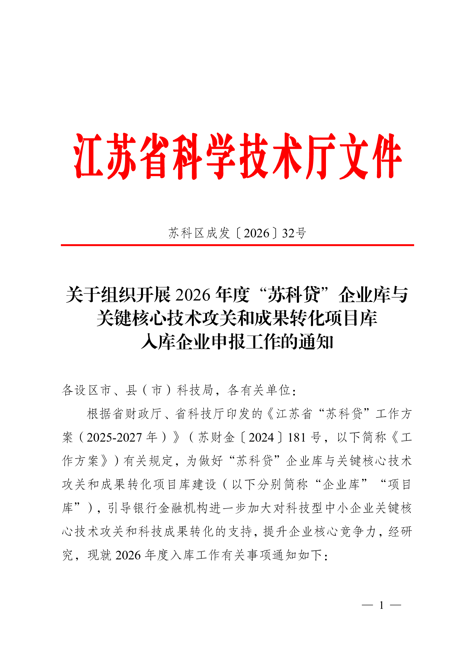 关于组织开展2026年度“苏科贷”企业库与关键核心技术攻关和成果转化项目库入库企业申报工作的通知