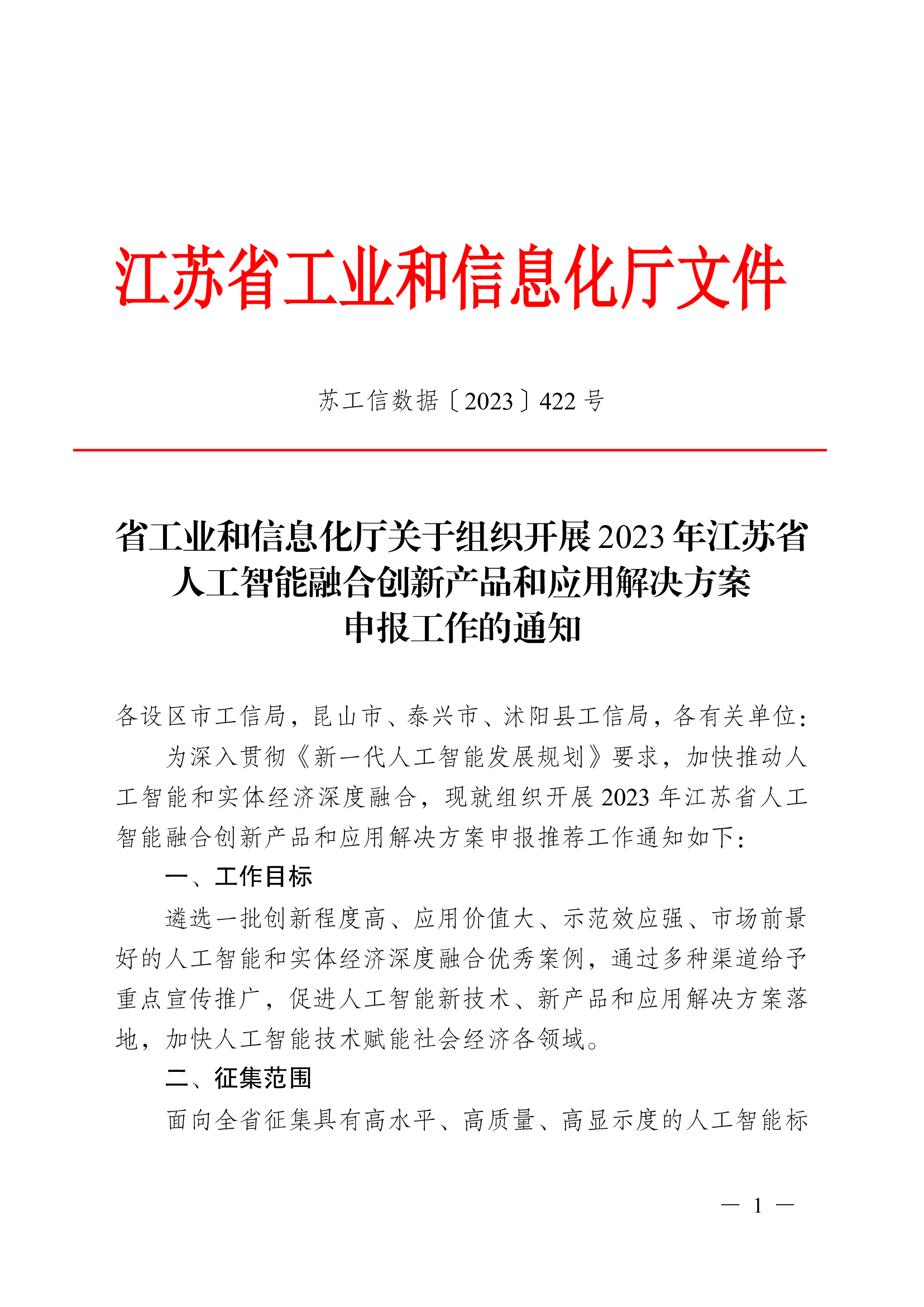 附件1:关于组织开展2023年江苏省人工智能融合创新产品和应用解决方案申报工作的通知