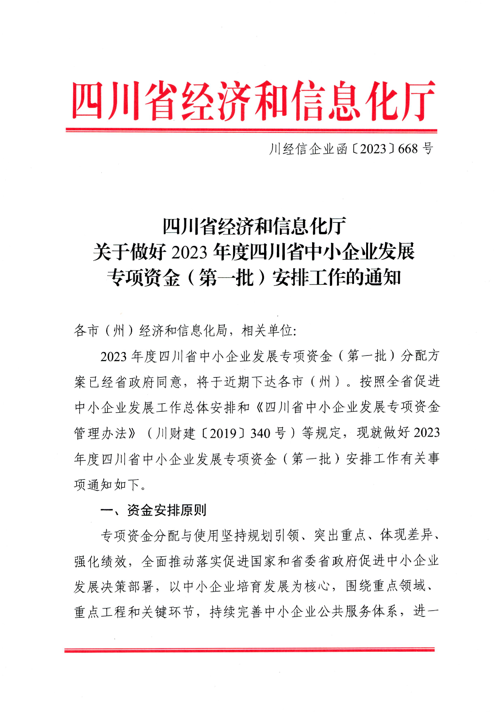 (川经信企业【2023】668号函)关于做好2023年度四川省中小企业发展专项资金(第一批)安排工作的通知