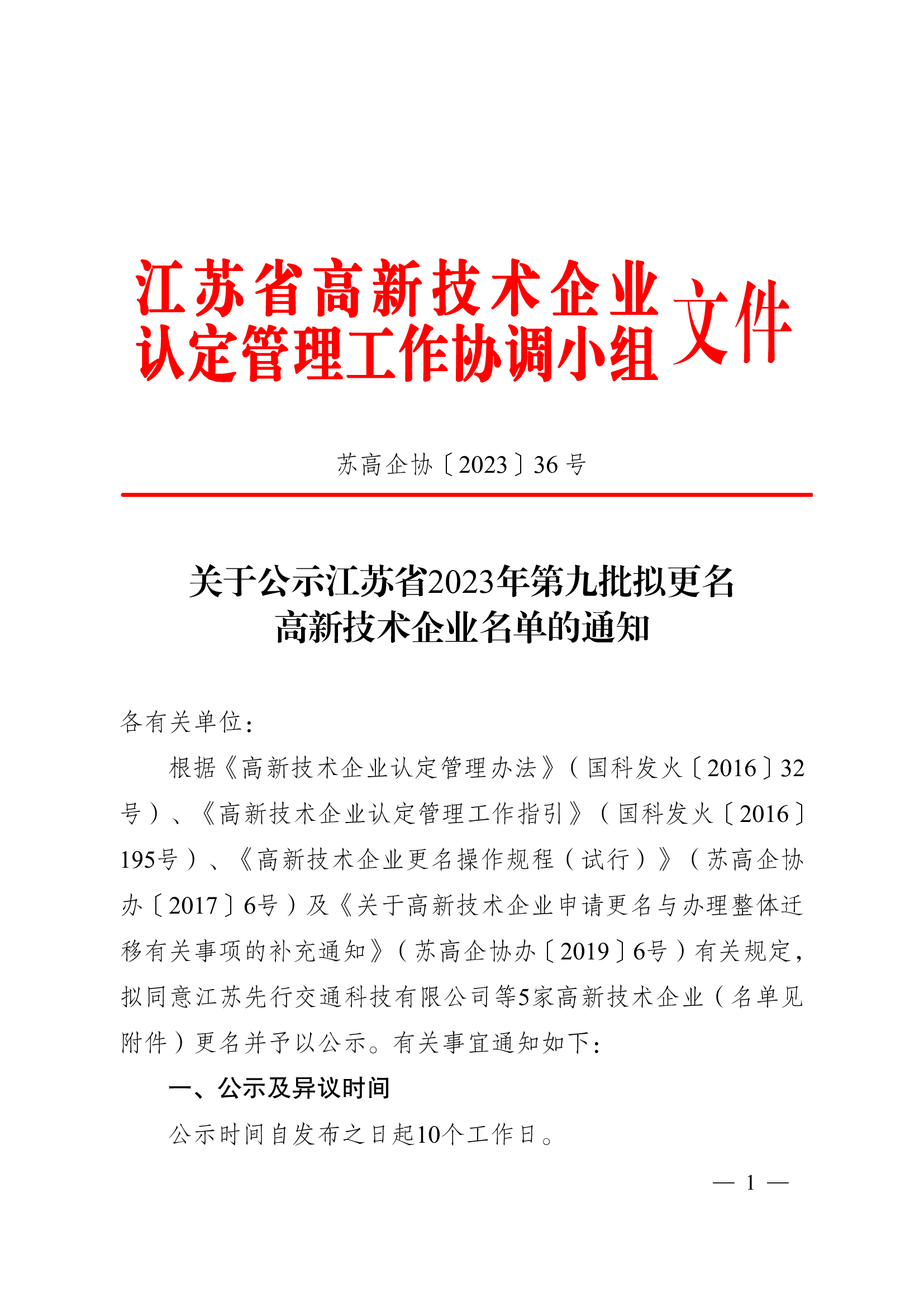 关于公示江苏省2023年第九批拟更名高新技术企业名单的通知