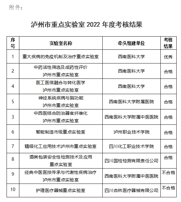 泸州市科学技术和人才工作局 关于2022年度市级重点实验室考核结果的公示