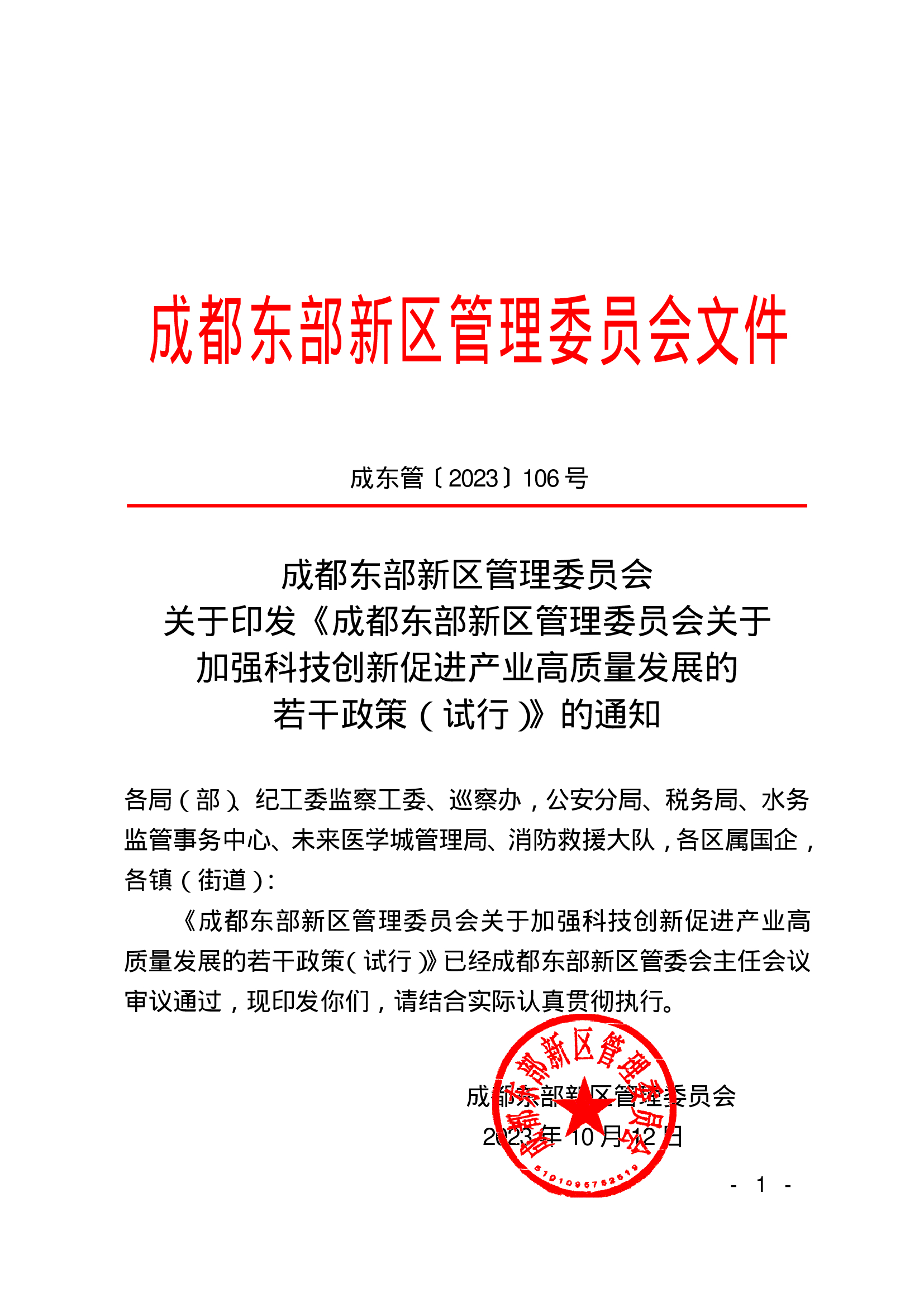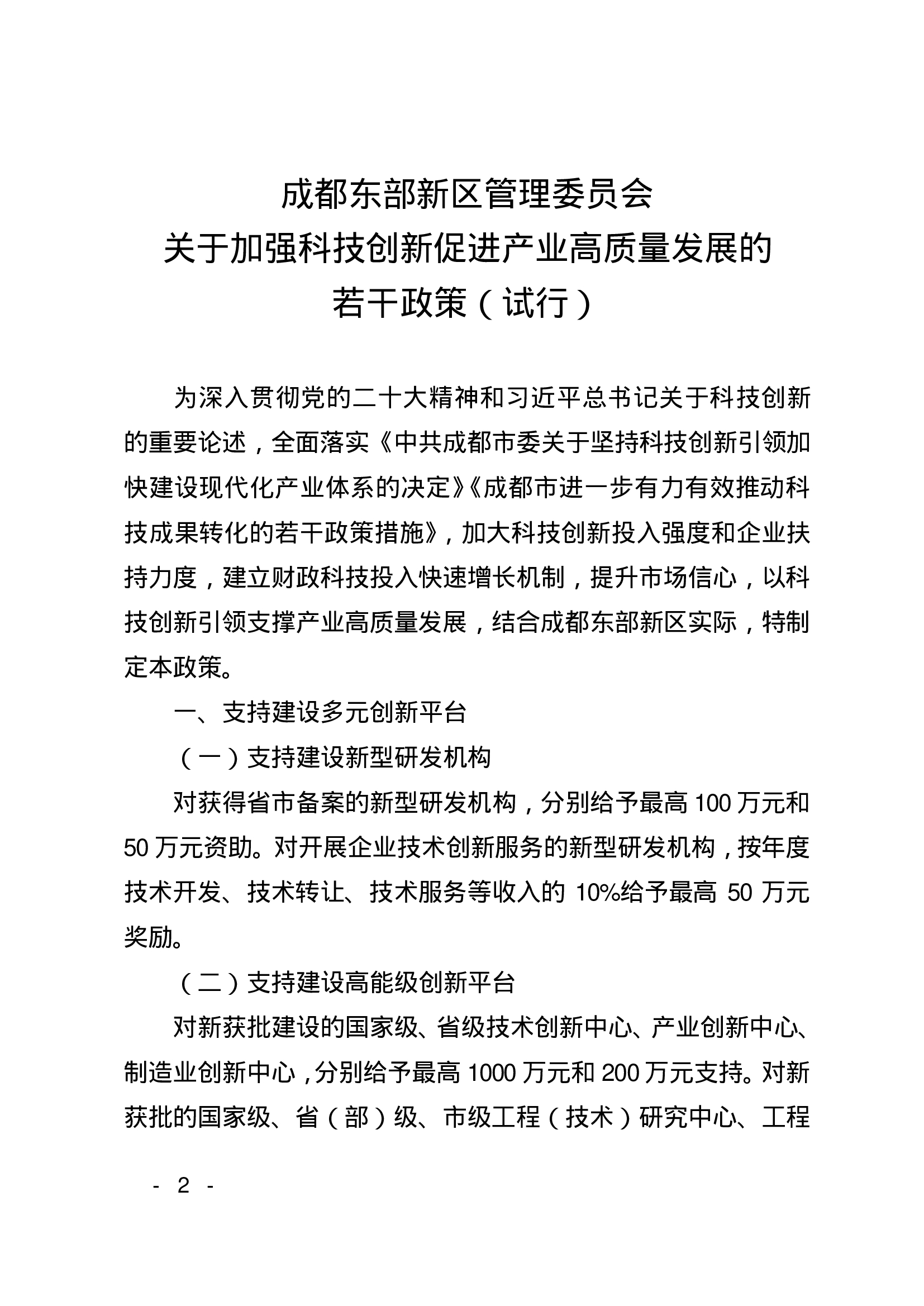 成都东部新区管理委员会关于印发《成都东部新区管理委员会关于加强科技创新促进产业高质量发展的若干政策(试行)》的通知